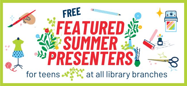 Teens ages 11 to 18 are invited to attend free, featured summer presenter events! Dive into Warhammer, watercolors, or self care. Try your hand at cosplay makeup, comedy improv, or printmaking. Draw some manga, weave a basket, or make some jewelry. Learn to crochet, create henna designs, craft balloon animals, and more!