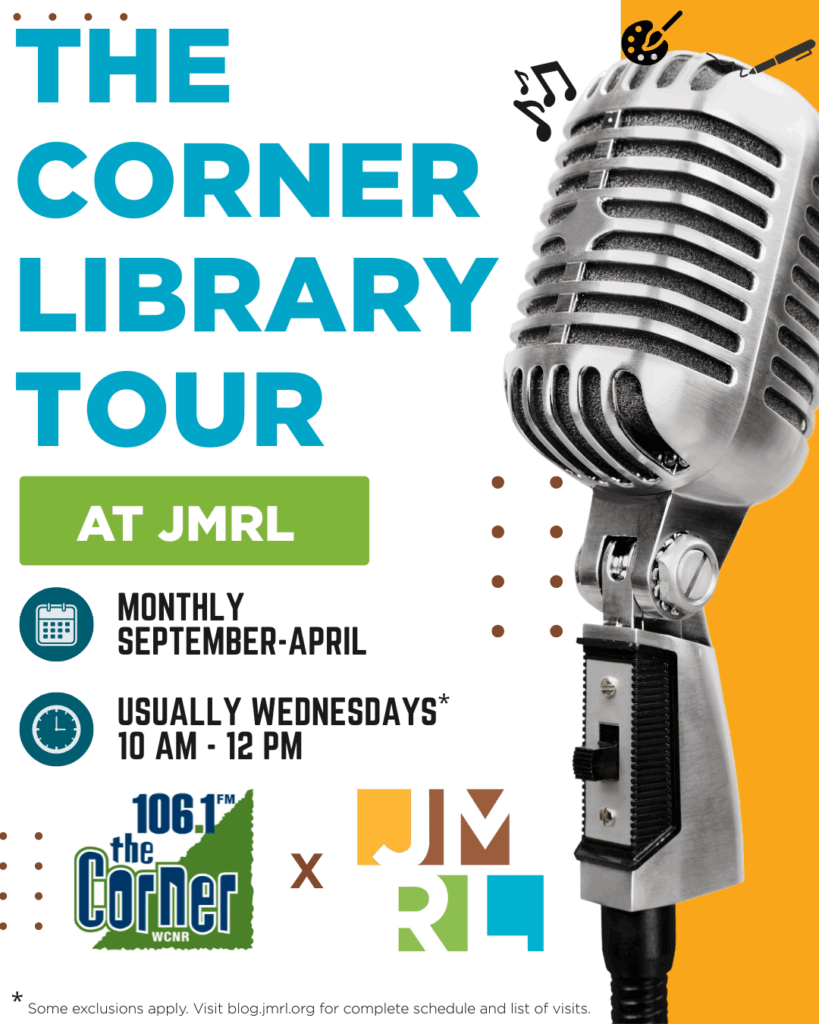 JMRL is excited to announce a brand-new collaboration with 106.1 The Corner! Starting this fall, you can catch monthly live broadcasts of The Corner’s midday show, hosted by Samantha Federico and Fievel, broadcasting right from JMRL branches across the region.